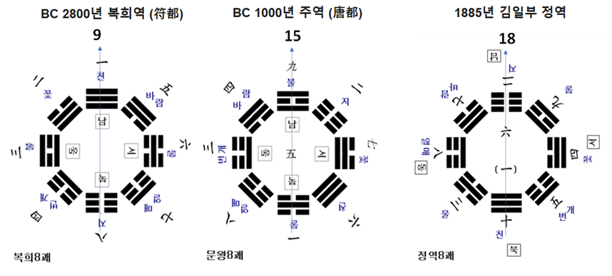 하나가 생겨나며 하늘에는 천상천하가 있고, 땅에는 높고 낮음이 있고, 사람에는 남자와 여자가 있습니다. 이들 음양은 그 자체로는 대척하지만 이들이 어우러져 만물이 생겨난다. 즉 하늘은 위, 아래, 그리고 내가 있는 공간, 땅은 높은 산, 낮은 바다, 그리고 내가 있는 대지, 그리고 사람은 아버지, 어머니, 그리고 태어난 내가 각각의 삼극을 만들고 나와 하늘의 천상천하의 관계, 나와 땅의 산과 바다의 관계, 그리고 나와 아버지 어머니와의 관계 속에서 하늘의 질서를 밝히는 선교(7), 땅의 질서를 밝히는 불교(8), 그리고 인간의 질서를 밝히는 유교(9)가 탄생했습니다. 따라서 나는 나와 하늘의 관계를 알려주는 선교, 나와 땅(자연)의 관계를 알려주는 불교, 그리고 나와 타인의 관계를 알려주는 유교가 내 몸에서 앙명인중 천지일 합일되어야 이 지구에서 원만히 살 수 있다고 하는 것입니다. 수학적으로 본다면 나투어진 우주는 x-y-z (천-지-인) 3차원으로 이루어져있고 각각에는 +/- (양/음)이 있습니다. 이들 천-지-인 음-양의 합 6개의 축이 우주의 기틀을 만듭니다. 이 기틀에 하늘의 도( 천, 7=6+1)를 알려주는 것이 선교요, 땅(지, 8=6+2)의 도를 알려주는 것이 불교요, 사람(인, 9=6+3)의 도를 알려주는 것이 유교입니다.