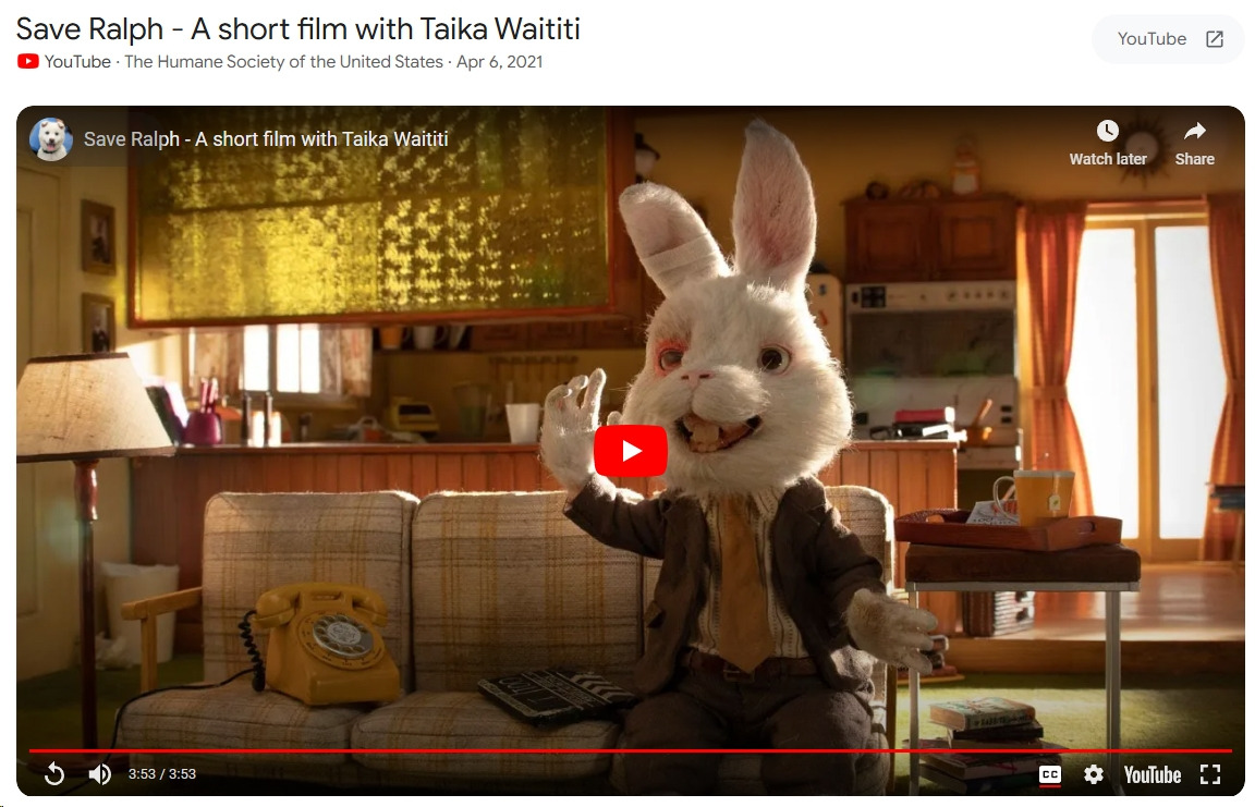 "Save Ralph"는 동물 실험에 반대하는 메시지를 전달하는 짧은 애니메이션 영화로, 토끼 랄프의 일상을 다큐멘터리 형식으로 그립니다. 랄프는 화장품 테스트에 사용되는 실험동물입니다.