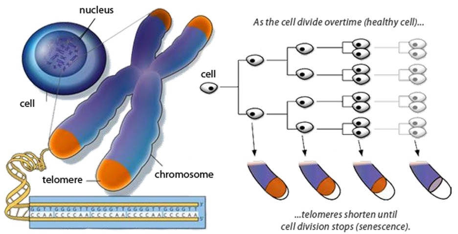 세포가 분열할 때마다 텔로미어는 조금씩 짧아집니다. 텔로미어가 너무 짧아지면 세포는 더 이상 분열할 수 없고, 이 상태에 도달한 세포는 기능을 상실하거나 죽음에 이르게 됩니다. 즉, 텔로미어가 수명을 결정하는 중요한 요소입니다. 보통의 세포는 50-60회의 세포분열을 거치면 텔로미어 길이가 다해 죽습니다. 세포에 따라 다르지만 매일 1회의 세포분열을 한다고 가정했을 때 50-60일이면 세포의 수명이 다한다는 것입니다.
