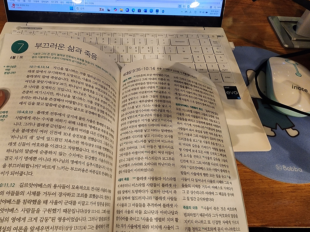 역대상 9장 35절부터 10장 14절까지 말씀을 읽고 ‘하나님은 하나님을 존중히 여기는 자를 존중히 여기시지만 하나님을 멸시하는 자를 경멸하신다’는 내용을 묵상하며 나와 다른 남을 존중하는 자세를 떠올렸습니다.