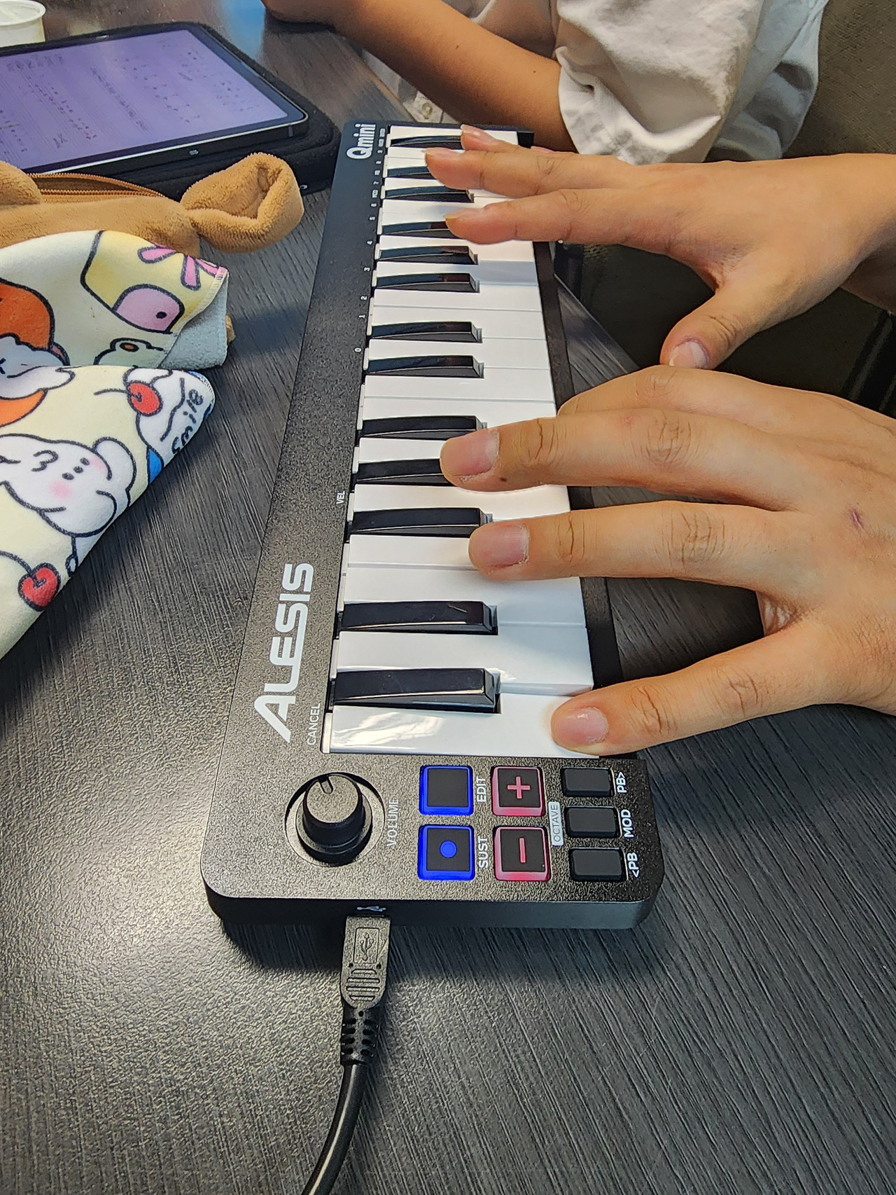 쉐카이나 예배가 모두 끝난 후 청년부실에서 쉬고 있을 때 유민이와 민서가 전자피아노로 건반을 치며 화음 연습을 하는 걸 봤습니다.