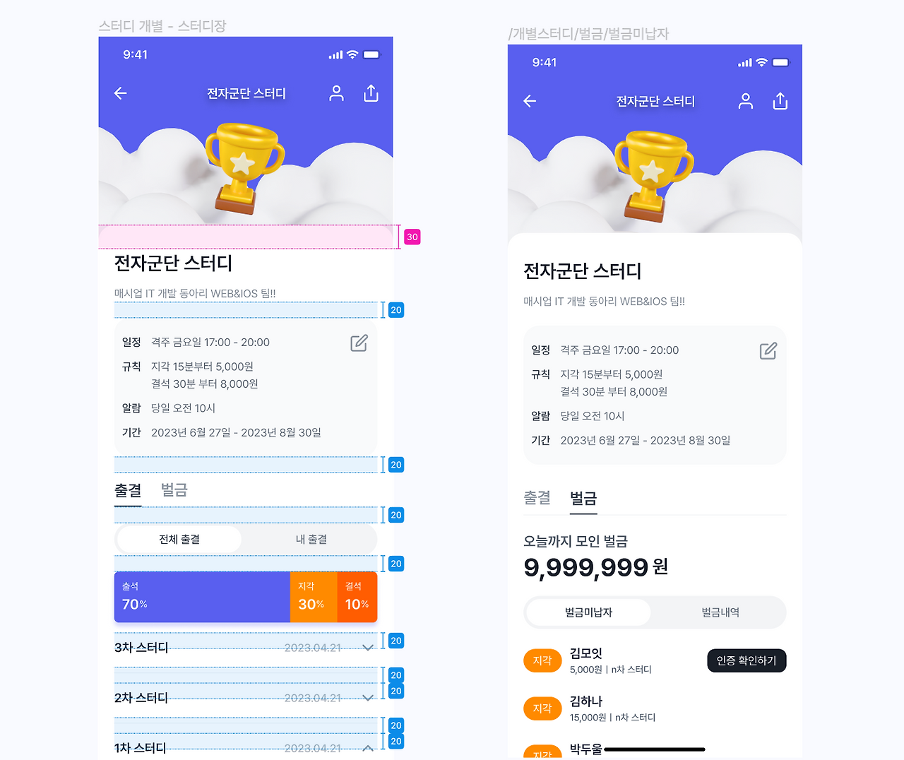 단점이 있다면, 화면 아트보드를 이동할 때 간격을 표시한 플러그인이 따로 움직이지 않는다. 이 부분이 조금 불편했는데, 그래서 화면 수정단계가 거의 없는 최종단계 (High Fidelity)에 이 플러그인을 사용했다.