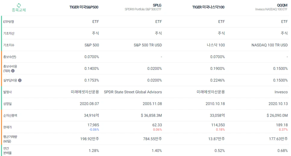 - 패시브 ETF : 운용 비용이 낮음. 매매가 적기 때문에 수수료 부담이 상대적으로 적음