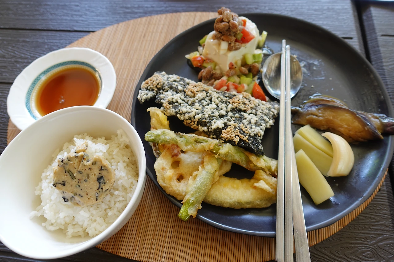 그리고 드디어 서풍골의 간장과 된장을 맛보았다. 따로따로 찍어서 맛을 보기도 했고, 간단한 채소와 함께 어우러진 핑거푸드를 먹어보기도 했다. 처음에 된장과 간장만 맛보았을 때는 짠맛 자체는 굉장히 강렬한데 풍미가 복합적이라고 느꼈다. 간장에서는 평양냉면 국물 같은 감칠맛이 느껴지기도 했고, 된장은 푹푹한 콩의 향이 짠맛과 어우러져 '구수하다'는 느낌이 새삼 두드러졌다. 서풍골에서 장을 담그기 시작한 것이 2019년이고, 우리가 먹은 장 중에도 2019년도에 생산된 장이 있었다. 생각보다 짠맛이 강해서 이런 장이라면 요리에 활용할 때 정말 조금씩만 써도 되겠다는 생각이 들었다. 이날 된장과 여러 토핑을 각자 넣어 장버터를 만들고, 물풀들이라는 팀에서 준비해주신 맛진 식사까지 할 수 있었다. 특히 장버터에 밥과 튀김용 간장을 비벼먹은 게 너무 맛있었다. 이 간장에는 셰프님이 1년 전에 만들어두신 레몬소금을 조금 넣으셨다는데, 그래서인지 풍미가 남달랐다.