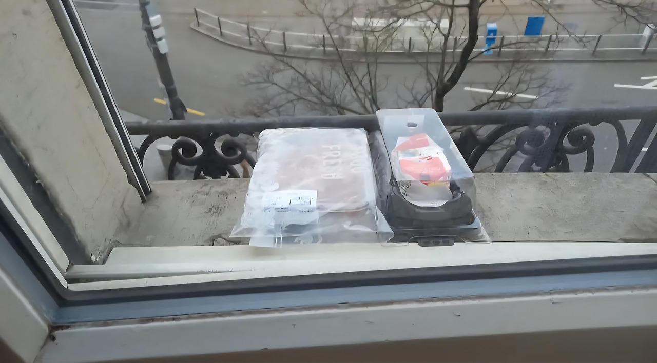 창문? 나는 여전히 정신이 없었지만 일단 창문을 열었다. 그 순간 나는 놀라서 얼어붙었다. 진짜로 햄과 버터가 창틀에 끼어 있었다. 나는 어이가 없어서 바로 사진부터 찍었다.