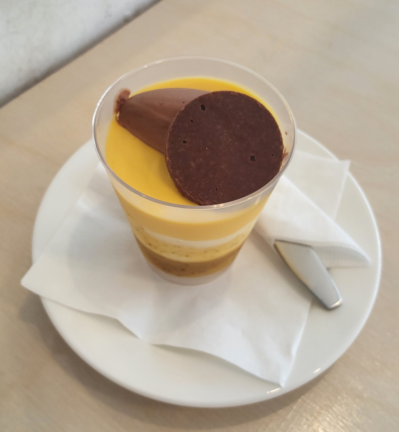 과일가게 겸 카페여서 그런지 과일 디저트에서 유독 특별함을 느낄 수 있었다. 아래서부터 순서대로 패션후르츠 퓌레, 망고퓌레, 크림층, 망고 무스, 초콜릿 무스, 크런치 초콜릿 코인이 올라가 있었다. 폭이 좁고 기다란 스푼으로 바닥이 닿을 만큼 깊게 꼽아 한입에 먹는 것이 제일 맛있다고 사장님은 방법을 알려 주셨다. 지구가 지각, 맨틀, 외핵, 내핵으로 이루어진 것처럼 층을 한 번에 뚫어 혀에 올리면 그 새콤함에서 8월의 햇살을 느낄 수 있었다. 나뭇잎 사이로 비치는 섬광이 눈동자를 관통해 혈관을 타고 흘러 심장을 뛰게 하는 태양의 맛. 아주 차갑지는 않지만 아이스크림처럼 부드러운 느낌과 열대과일의 신맛은 더위에 녹아버린 입맛에 물을 주듯 생기를 찾게 했다.
