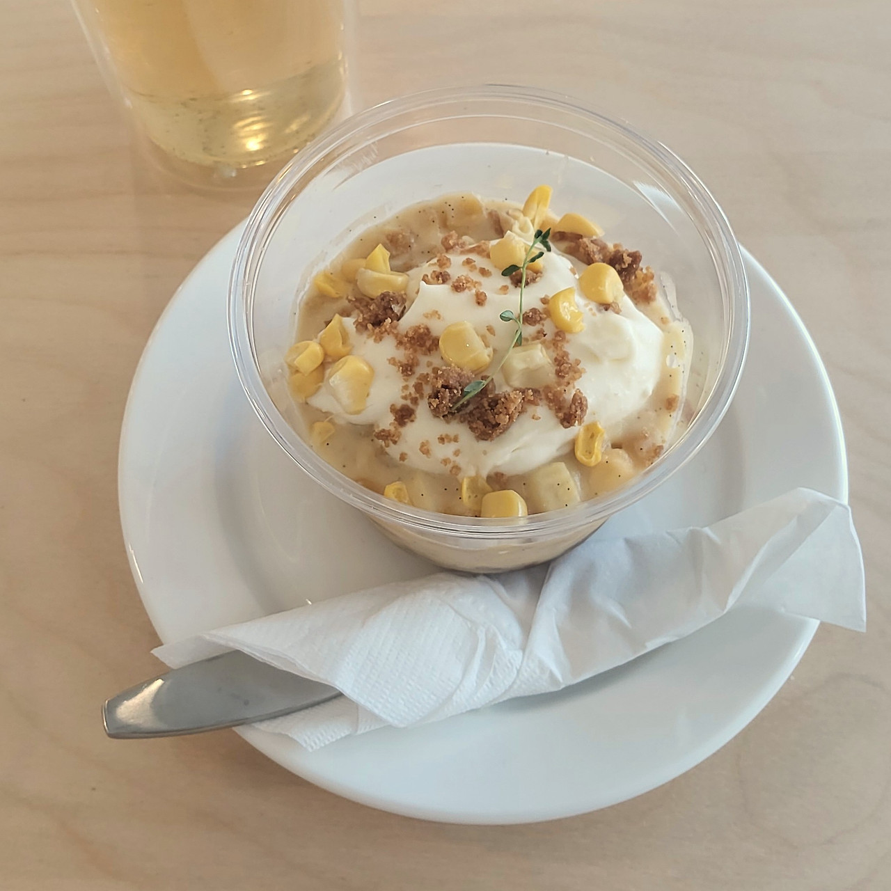 두 번째 방문했을 때에는 고대하던 옥수수 푸딩을 먹을 수 있었다. 푸딩이라고 하면 캐러멜 소스에 탱글한 일본식 푸딩을 생각할 수 있지만 미국의 바나나 푸딩처럼 크림 제형의 푸딩이었다. 아몬드 크럼블 위에 바닐라빈을 잔뜩 넣은 초당옥수수 커스터드 크림에 마스카포네 크림이 올라가 있었다. 옥수수로 만든 과자는 몇 입 먹으면 사료를 씹는 것 같아 쉽게 질려하는 편인데, 초당옥수수로 만든 푸딩은 컵을 핥을 기세로 먹을 만큼 맛있었다. 초당 옥수수 커스터드 크림은 묵직하면서 부드러웠고 느끼하지 않았다. 밑에 깔린 아몬드 크럼블은 커스터드 크림의 수분을 머금어 촉촉했다. 두텁게 올라간 마스카포네 크림, 다른 가게에서 초당옥수수 바스크 치즈케이크를 먹을 때에도 느꼈지만 옥수수는 정말이지 치즈와 잘 어울리는 작물인 것 같다.