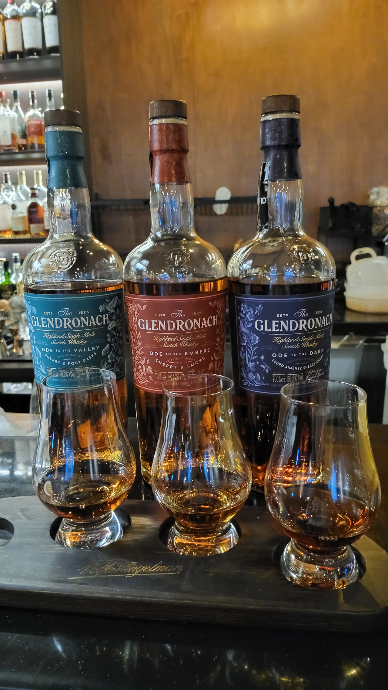 레몬 버터바는 독특하게도 잘라먹을 수 있는 칼이 아니라 중식도의 축소판에 가까운 미니 도끼가 제공되었다. 냉장고에서 막 꺼내서 그런지 생각보다 단단해서 힘을 주어 잘라야 했다. 버터의 느끼함을 레몬의 산미가 감싸주어 고소함만을 느낄 수 있도록 해주었다. 그리고 바에 앉아 장식장에 진열된 병을 구경하는 동안 글렌캐런에 담긴 위스키가 나왔다. 메스실린더에서 30ml는 무척 적어 보였는데 글렌캐런에 담겨 있는 위스키 30ml는 되게 양이 많아 보였다. 카페를 한지는 10년, 위스키에 입문한 지는 4년이 되었다는 사장님은 위스키 무지렁이를 위해 간단한 위스키 종류 구분법과 마시는 방법을 소개했다. 위스키를 하이볼이 아닌 단독으로 마시는 것은 처음이었기 때문에 설렘반 기대반으로 첫 입을 대었다. 영롱한 호박빛으로 캐러멜을 녹인 듯한 색깔과 달리 코가 찡하게 매웠다. 처음 먹는 음식도 3번을 먹으면 익숙해진다고 했던가. 3모금을 마시니 익숙해지며 향을 느낄 수 있었다. '오드 투 더 밸리'는 베리류, '오드 투 더 앰버스'는 훈연향, '오드 투 더 다크'는 초콜릿향이라고 하는데 초보인 내가 구분할 수 있는 것은 오드 투 더 앰버스의 피트 향 정도였다. 가을의 비에 떨어지는 낙엽과 나무껍질을 술로 내린다면 이런 맛이구나 하는 생각이 들었다.