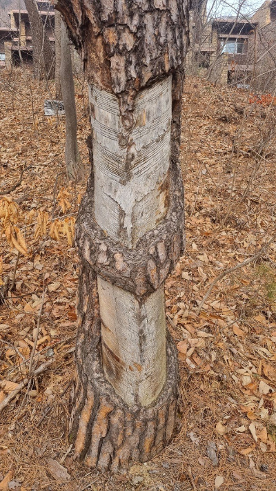 일제 강점기 송탄유를 채취하기 위해 소나무에 ‘V’ 자형 상처가 만들어졌지만,