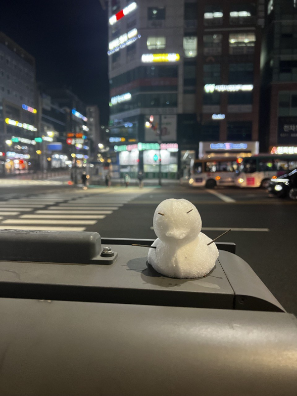 신호등 제어함 위에 누군가 만들어 놓은 작은 눈오리가 보인다.
