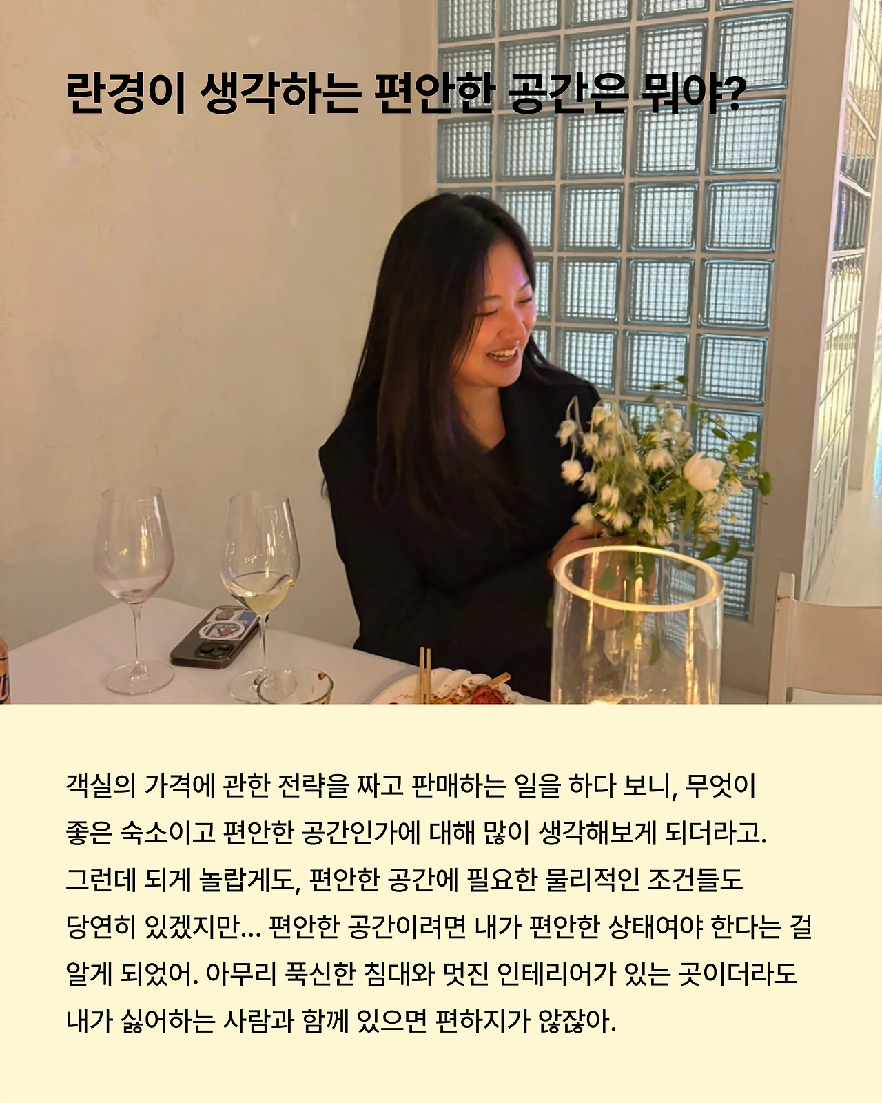 객실의 가격에 관한 전략을 짜고 판매하는 일을 하다보니, 무엇이 좋은 숙소이고 편안한 공간인가에 대해 많이 생각해보게 되더라고. 그런데 되게 놀랍게도, 편안한 공간에 필요한 물리적인 조건들도 당연 있겠지만 .. 편안한 공간이려면 내가 편안한 상태여야 한다는 걸 알게 되었어.