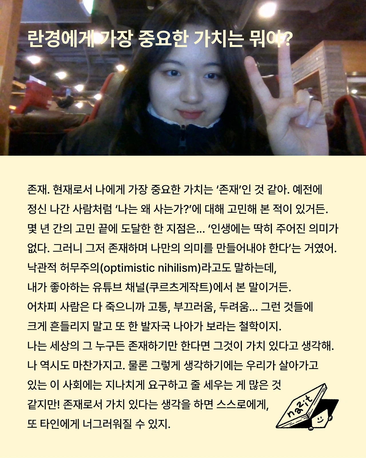나는 세상의 그 누구든 존재하기만 한다면 그것이 가치 있다고 생각해. 나 역시도 마찬가지고. 물론, 그렇게 생각하기에 우리가 살아가고 있는 이 사회에는 지나치게 요구하고 줄 세우는 게 많은 것 같지만! 존재로서 가치있다는 생각을 하면 스스로에게, 또 타인에게 너그러워질 수 있지.