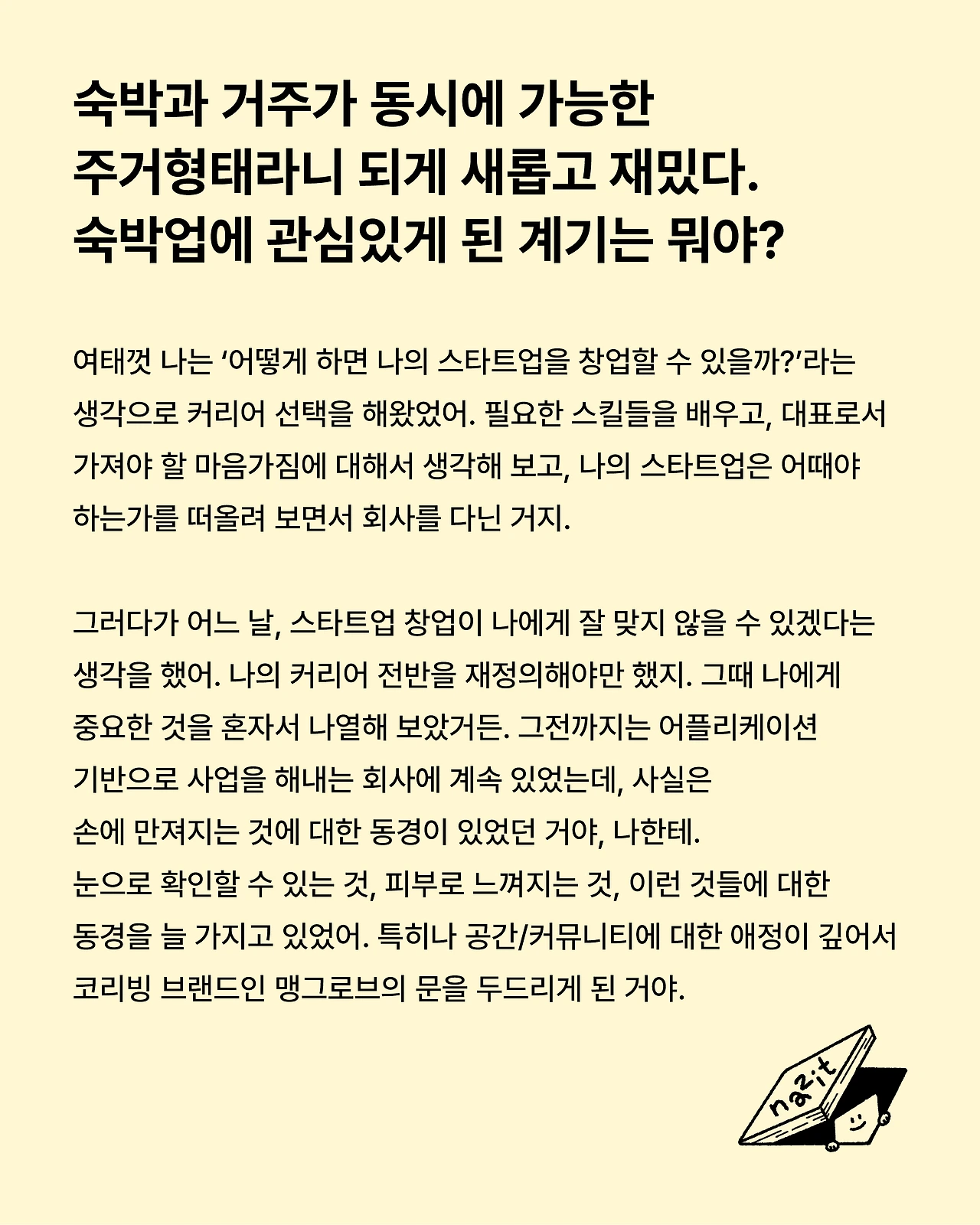 눈으로 확인할 수 있는 것, 피부로 느껴지는 것, 이런 것들에 대한 동경을 늘 가지고 있었어. 특히나 공간/커뮤니티에 대한 애정이 깊어서 코리빙 브랜드인 맹그로브의 문을 두드리게 된거야.