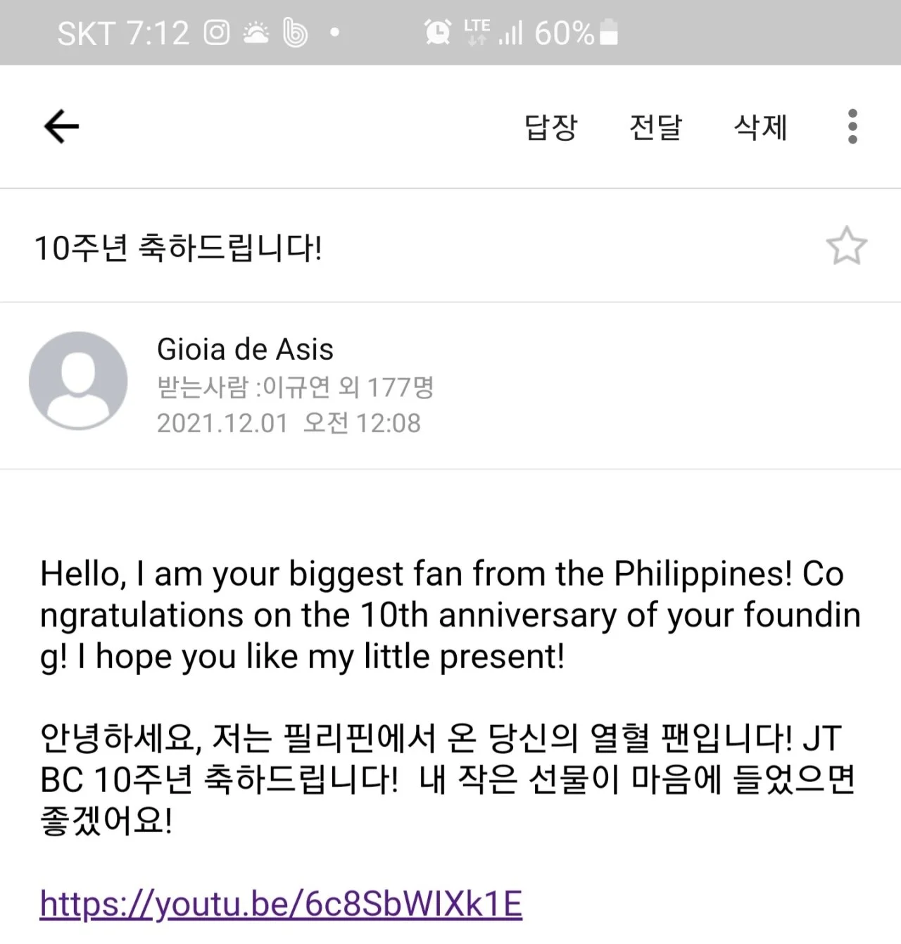 -팬의 축하 메시지(감사합니다. 열심히 뛰겠습니다)-