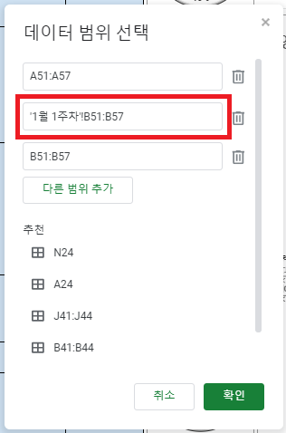 5. 2번 칸에 '1월 1주차'!B51:B57을 입력한 후 확인 버튼을 누릅니다.