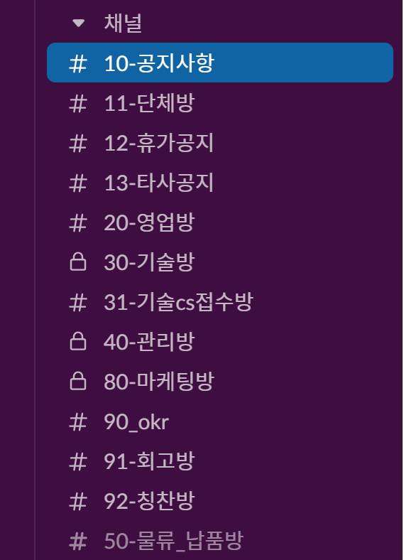 예를 들어 휴가 공지는 12번, 타사 공문이나 공지 방은 13번. 각 방에 성격에 맞게 구성원은 메시지를 남긴다.