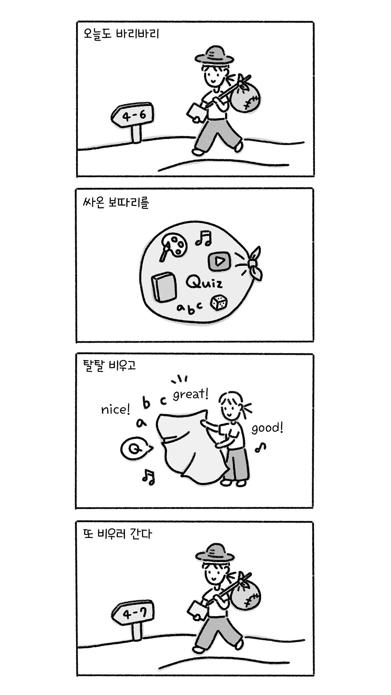 오늘도 보따리를 탈탈 비워 시간을 채웠다. 주섬주섬 다시 챙겨서 옆 반에 간다. 나머지 네 반 수업이 끝나면, 너덜너덜해진 보자기에 내일의 활동들을 새로 담는다.