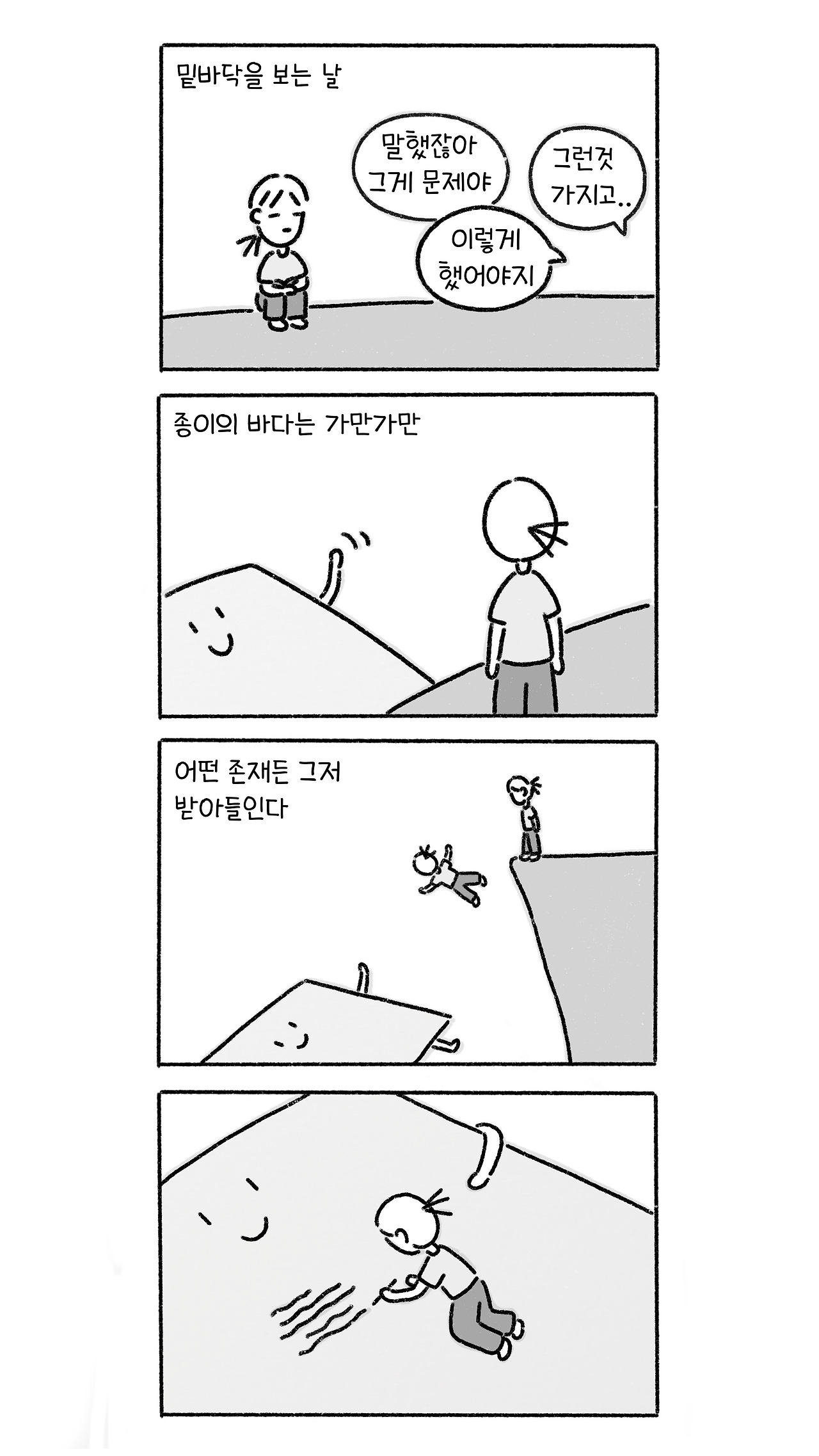그래서 쓰게될 때가 있다. 남에게 꺼내 보일 수 없는 밑바닥, 날것의 감정 표출을 종이는 말없이 받아주는 것이다. 아픈 이에게 어떠한 자극도 가하지 않는 존재. 종이는 펜이 남기는 날카로운 흔적을 가만히 받아들인다. 받아들여지는 기분만으로 치유되곤 했다.