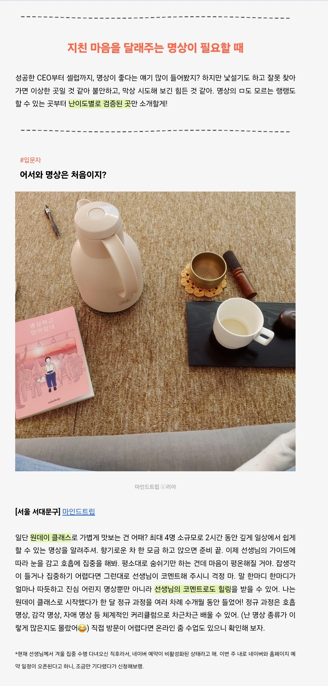 2024년 1월 18일 자로 발행된 Z세대의 주말을 책임지는 뉴스레터 '주말랭이'에 객원 에디터로 참여했다. 명상을 주제로 명상 난이도에 따라 오프라인 센터 3곳 선정해 소개했다. 두 곳은 실제로 내돈내산으로 경험했던 곳이고 한 곳은 명상에 관심 있는 사람이라면 잘 아는 너무나 유명하고 역사 깊은 곳이다. (명상쌤이 추천하셨던!) 주말랭이의 팀원분들, 창립 역사, 비즈니스 모델, 인터뷰 등을 다 알고 있을 정도로 오랫동안 애정하던 뉴스레터에 참여해서 더욱 좋았다.