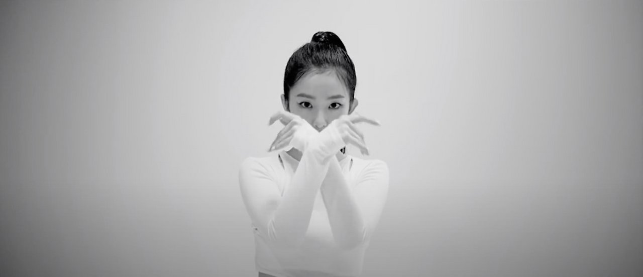 두 번째 후렴. 밝은 벽의 직선 패턴 앞에서 춤을 추는 아이린과 슬기