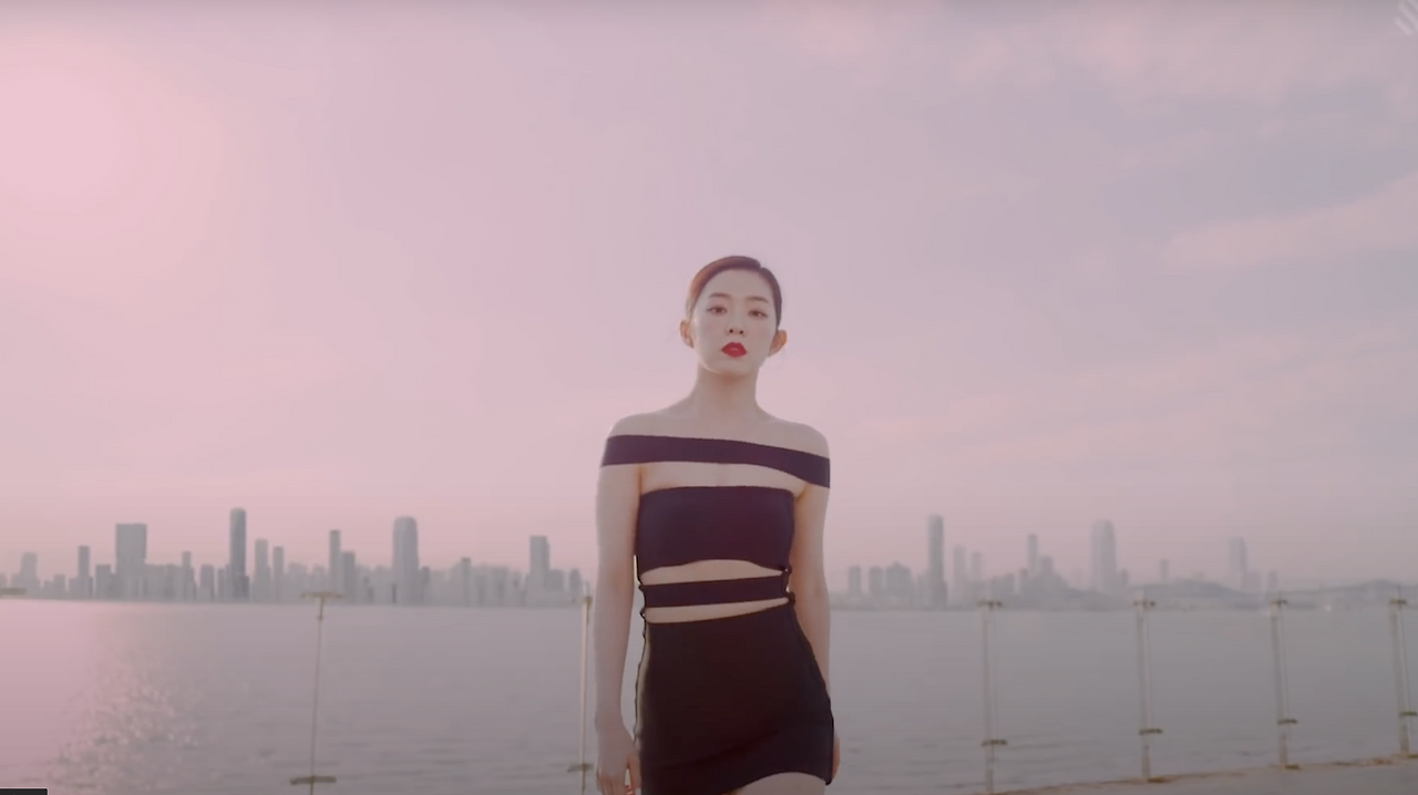 먼저 아이린을 보자. 밝은 실외에서 가로 직선이 강조된 짧은 원피스를 입고 있다.