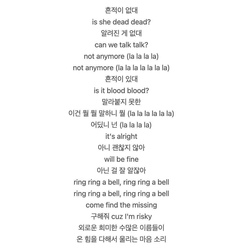 특히 'is she dead?'라는 가사가 인상적이었습니다. 어쩌면 굉장히 섬뜩한 문장이잖아요. 그 뒤의 'is it blood?'랑 같이 해석되면 더더욱이요.