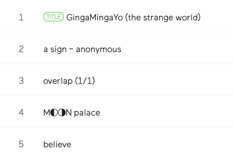 2번 트랙 'a sign ~ anonymous', 3번 트랙 'overlap (1/1)', 4번 트랙 'M◐◑N palace'에는 모두 작곡가 밍지션이 참여했습니다. 밍지션은 SM 아티스트들의 작업으로 꽤나 유명합니다. 수록곡을 듣고 레드벨벳이 떠올랐다면 나름 타당한 판단입니다. 밍지션의 곡 중 잘 알려진 것으로는 웬디의 'When This Rain Stops', NCT U의 'From Home', 레드벨벳의 'Queendom' 등이 있습니다. 그런데 개인적으로 좋아하는 곡은 NCT DREAM의 '내게 말해줘(7 days)'와 레드벨벳의 'Time to love'입니다. 둘 다 타이틀 아니고, 수록곡이에요. 메인의 무게감, 부담감이 덜한 수록곡에서의 밍지션의 산뜻한 선율에 마음이 가는 것 같습니다. 메인디쉬를 잘하는 셰프가 있고, 전채나 후식을 잘하는 셰프도 있는 거죠. SM 엔터의 곡은 아니지만, 케이팝 팬들 사이에서 꽤나 유명한 공원소녀의 숨겨진 명곡 '공중곡예사 (Wonderboy, the Aerialist)'도 밍지션의 곡입니다(완전 추천!!!).