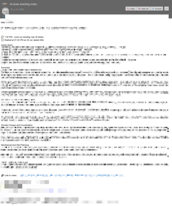 회의 영어에도 훌륭한 커닝페이퍼가 있다. 도면, 자료들과 더불어 Meeting Minute (이하 회의록)이 있는데, 혹여나 처음 마주하게 될 영어 단어들이라도 모두 회의록 안건으로 적혀있다. 이렇게 눈으로 먼저 익힌 단어들은 실전 대화 때 훨씬 더 잘 들린다. 여기에 기술 발전의 AI도 한 몫한다. Zoom이라는 화상 회의 플랫폼은 화상 회의가 끝난 후 Meeting Notes를 생성해 주는데, 아주 약간의 실수는 있지만 AI의 받아쓰고 요약하는 수준은 제법 훌륭하다.