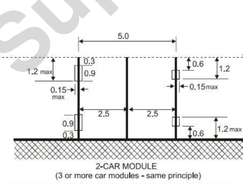 위와는 달리 기둥이 주차공간 앞 또는 끄트머리부터 1.2m를 넘는 곳에 위치할 경우, 기둥은 벽으로 간주된다. 이것은 주차 공간은 벽으로부터 반드시 1'-0"만큼 떨어져야 하는 By-law의 조항 때문에, 위 같은 기둥은 양 옆으로 1'-0" 띄운 후 주차공간이 들어오게 되는 것. 만약 이 기둥들이 일렬로 (n) 개가 배열되어 있다면, 그 사이를 Parking Stall을 채우기 위해 (n) x 2'-0"만큼의 막대한 공간이 비효율적으로 허비된다.