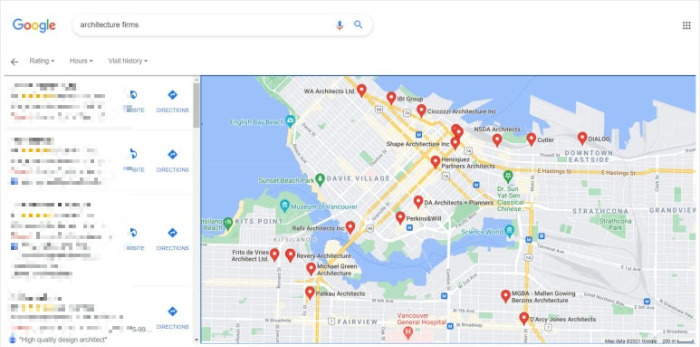 회사를 찾는 첫 번째 방법은 구글맵 검색 기능을 이용하는 것이다. 지도 위 회사들의 위치를 한눈에 볼 수 있어 좋은데, 통근 거리와 시간, 통근 수단을 통해 선호하는 회사들을 추릴 수 있다.