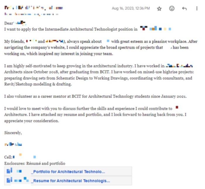 첫 번째 이유는 회사들이 지원자의 이메일을 꼼꼼히 읽지 않는 듯한 경험 때문이다. 이메일 하나하나에 공들이기 보다는 큰 틀의 커버레터를 하나 만들어두고 지원하려는 회사 이름만 복사 붙여놓기로 바꿔가며 각각의 회사에 지원하기를 제안하고 싶다. 이 경우 하루 이틀만에 50개든 100개든 이력서를 낼 수 있다. 두 번째 이유는 인맥 없이 지원하는 경우 회사와 인터뷰 성사율 자체가 낮기 때문이다. 나의 경우 총 8개의 회사에서만 인터뷰 회신이 왔고, 그중 한 군데는 이력서를 낸 지 석 달 뒤에 이메일이 왔다. 따라서 이력서 지원 량을 최대한 많이 가져가는 전략을 조언한다.