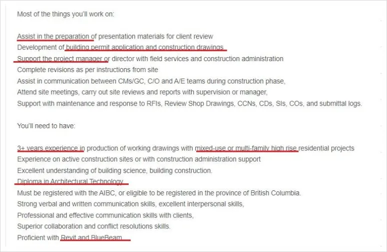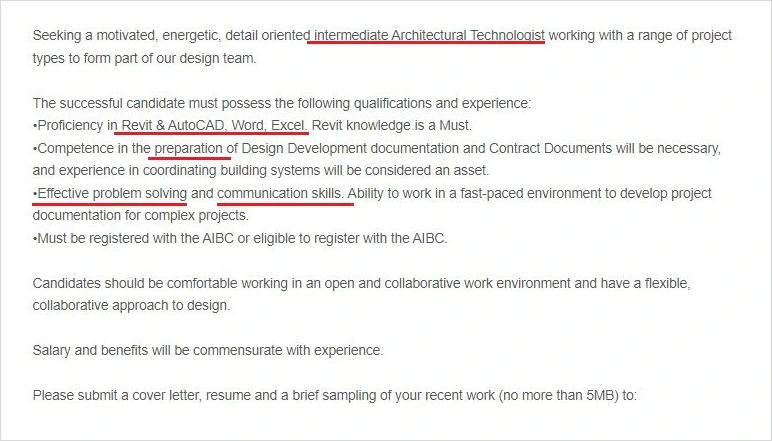 회사 웹사이트의 채용공고 또는 AIBC***같은 건축 협회의 채용공고에서 회사의 성향을 짐작할 수도 있다. 아래 두 채용공고는 똑같이 저년차 Technologist를 뽑는데, 원하는 인재상이 확연하게 다름을 볼 수 있다.