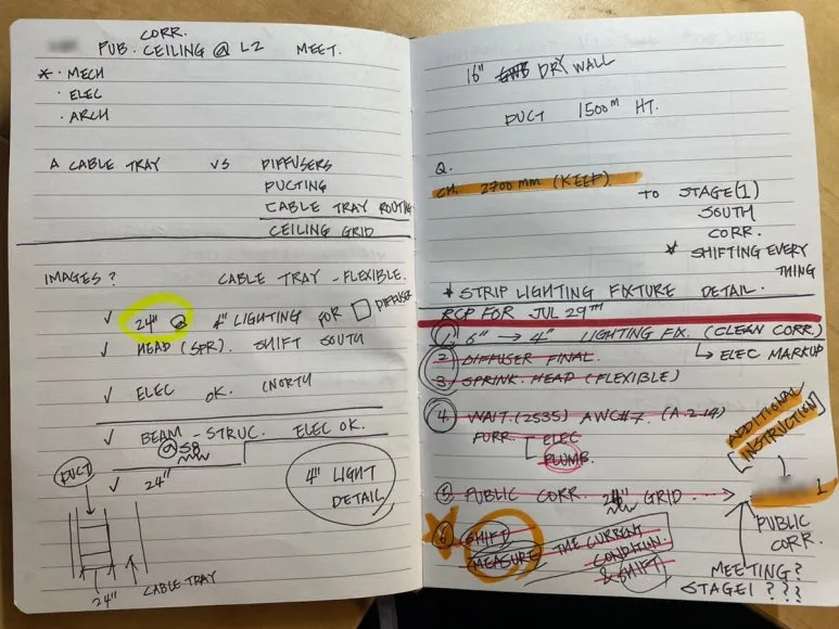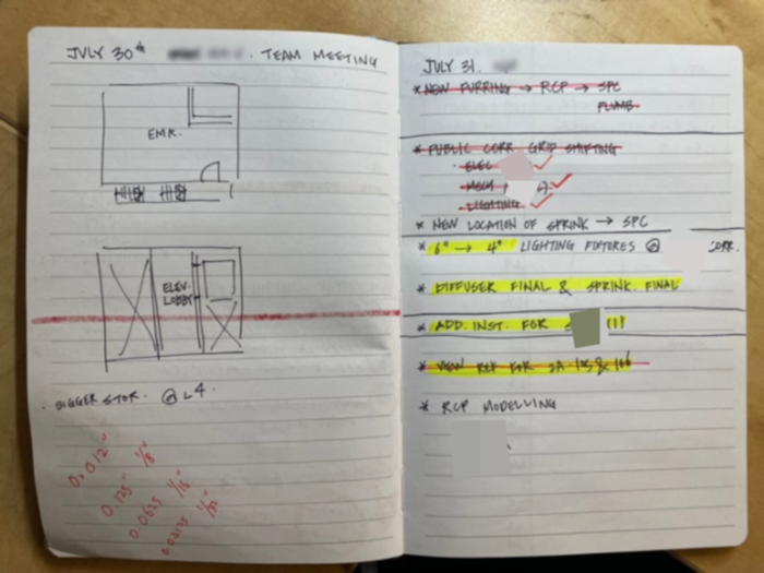 매 장 첫 줄은 날짜와 프로젝트 이름을 적는다. 평범한 업무는 서두에 더 적을 내용은 없지만, 미팅/회의 노트 테이킹의 경우 반드시 상단에 표시해 둔다. 추후 업무 중 미팅 때 기록했던 아이템과 특이사항을 확인하기 위해 다시 노트를 펼칠 때가 자주 있기 때문이다.