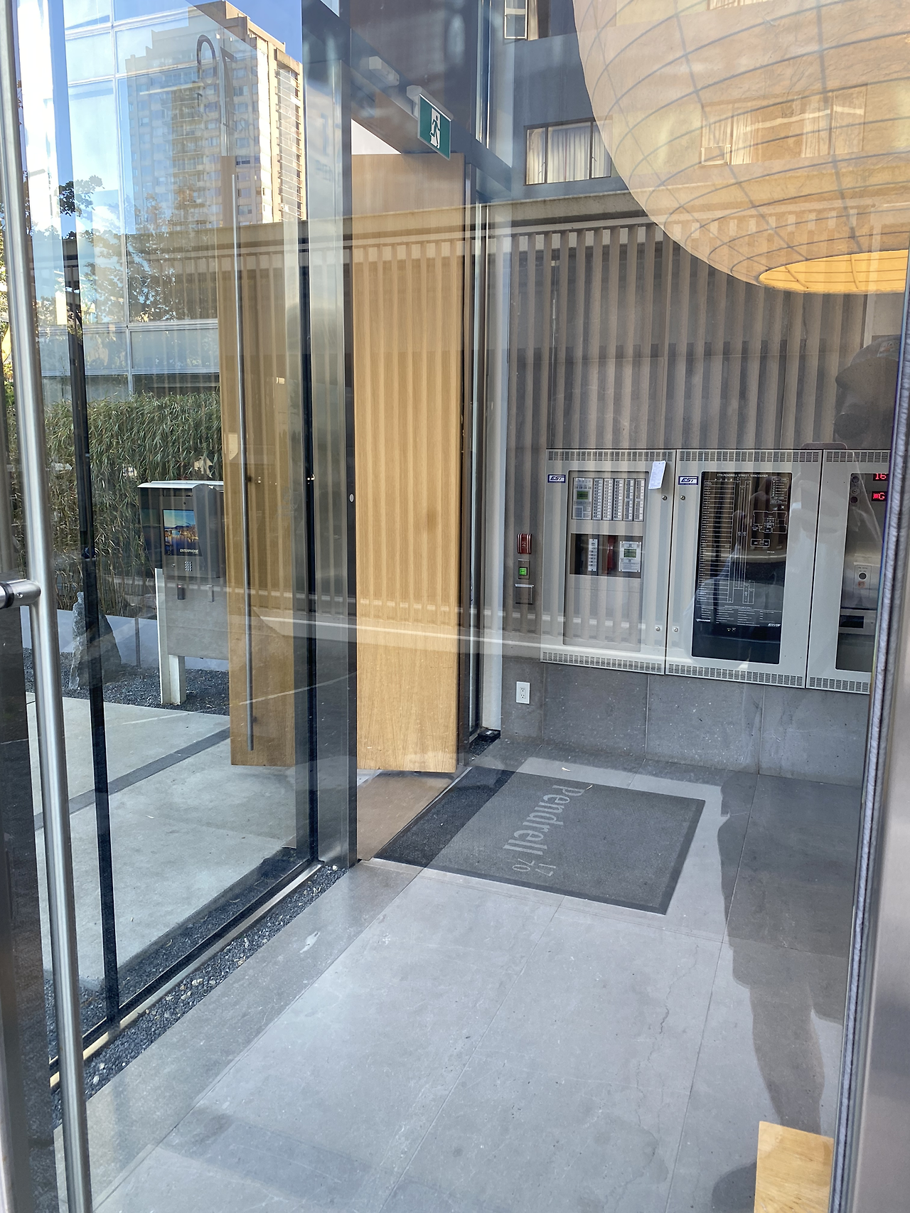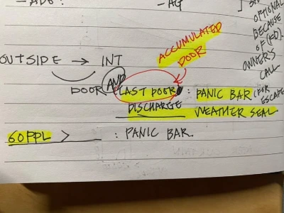 비상문들 중 가장 마지막 (건물 밖에서 볼 때는 가장 첫) 비상문에 Panic Bar와 Weather Seal을 설치한다. 또한 Occupancy Load가 60명 이상일 때도 Panic Bar를 설치. 하지만 선배의 프로젝트는 현관문이 긴 통유리였기 때문에 심미적 요소를 방해하는 투박한 Panic Hardware를 달지 않고 건축 법규 상 대안***을 찾았다.