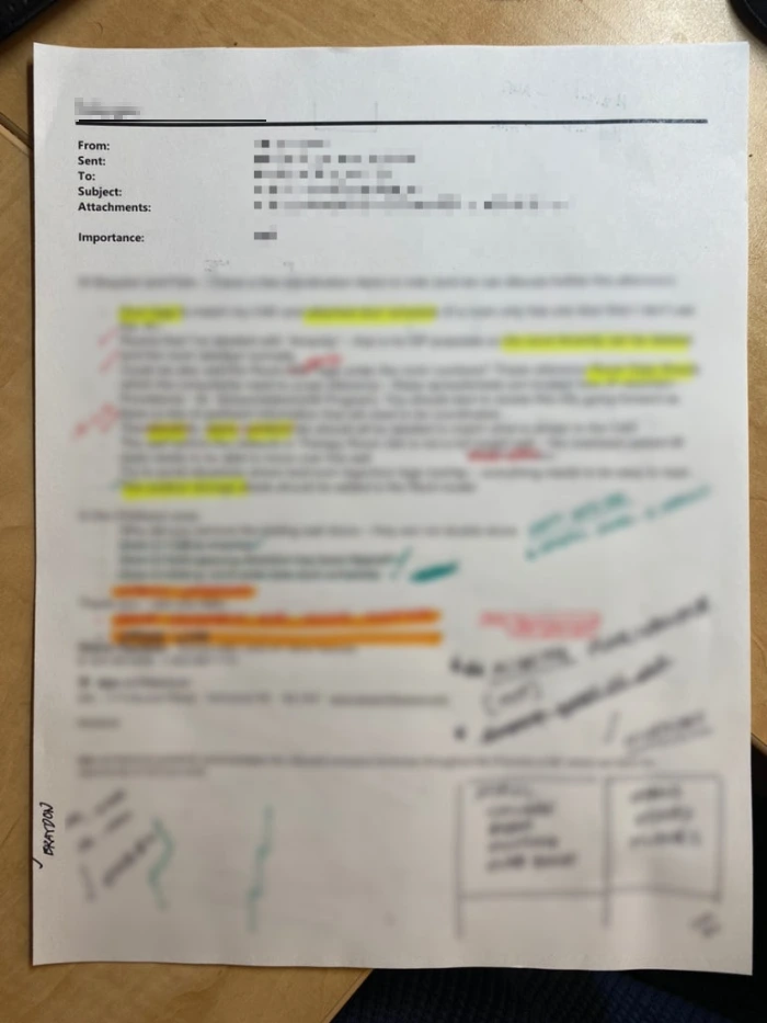 Outlook Email로 업무 리스트가 온다면, 더할 나위 없이 좋다. 프린트한 후, 내가 담당해야 할 업무들을 하이라이트로 표시, 추후 완료한 업무는 줄을 긋는다. 관련한 아이템들이 있다면 옆에 적어두고, 관련된 질문이 있으면 역시 적어둔다.