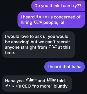 그리고 하루는 이중 한 동료가 나에게 추천할 만한 지인을 있는지 수소문한 적이 있었다. 당시 그 회사의 연봉을 들은 터라 마음이 흔들렸던 찰나, 내가 지원할 수 있는지를 물었는데 아래 이유로 나는 지원자격이 불가했다.