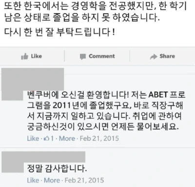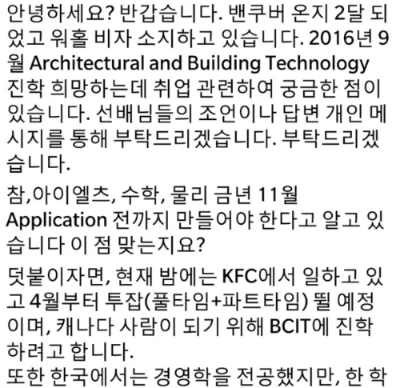 • 새로 사귄 친구의 여자친구, 캘거리에서 건축학부 졸업하고 밴쿠버로 취업했었는데, 전혀 친해지지 못했다. 돌이켜 보면, 친분을 유지하며 네트워크를 유지했을 텐데 그렇게 하지 못했다.