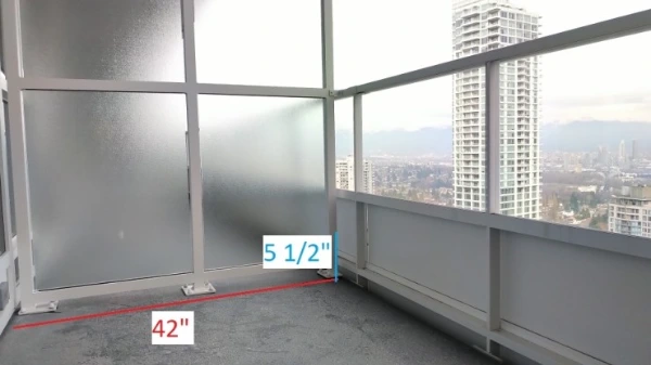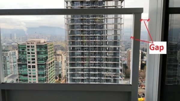 3 15/16" 길이는 생각보다 길다. 그래서 발코니에 보이는 모든 틈들의 수치를 일일이 Measure tape을 이용할 필요는 없다. 아래 사진의 오른쪽 간격은 2"도 안 되는 틈이다. 현장에서 육안으로 그 틈이 매우 크게 느껴질 때만 줄자를 대 보도록 한다.