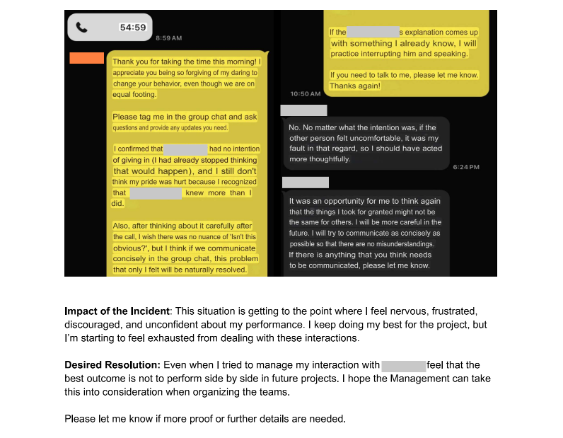 아래는 그동안 쌍방 간 문제해결을 위해 최소 두 번 시도했었음을 회사에 알려주고 싶었다. 이 대화들은 서너 달 전 대화였기 때문에 최대한 내 기억을 의존하였다. (내 기억에 의존했기 때문에, HR이 동료에게 이 보고서를 보여주기 원했다.)