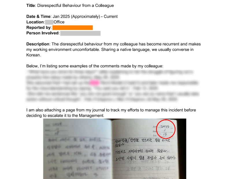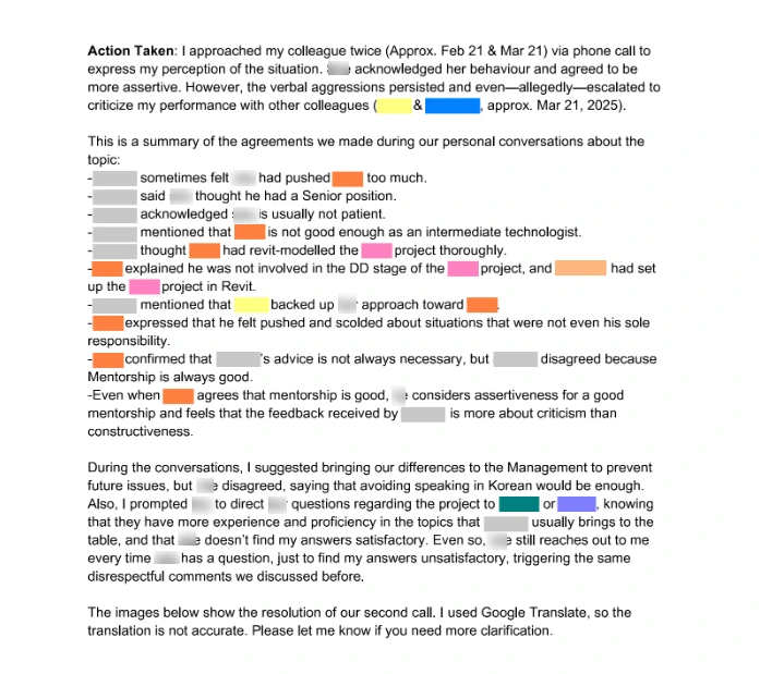 나는 개인 저널을 사건의 시초(?) 증거로 첨부했는데, 영어 번역을 아래 덧붙였다. 이 다툼은 2025년 5월 말 6월 초에 벌어진 일이라, 동료로부터의 불편한 감정이 연초부터 있었음을 이번 기회에 알게 되었다. 이 저널은 상대방을 특정하지 않고 자아성찰 성격이었지만, 그(녀)와 업무에 있어 나의 첫 심리상태의 기록 즈음으로 회사가 살펴줄 것을 기대하였다.