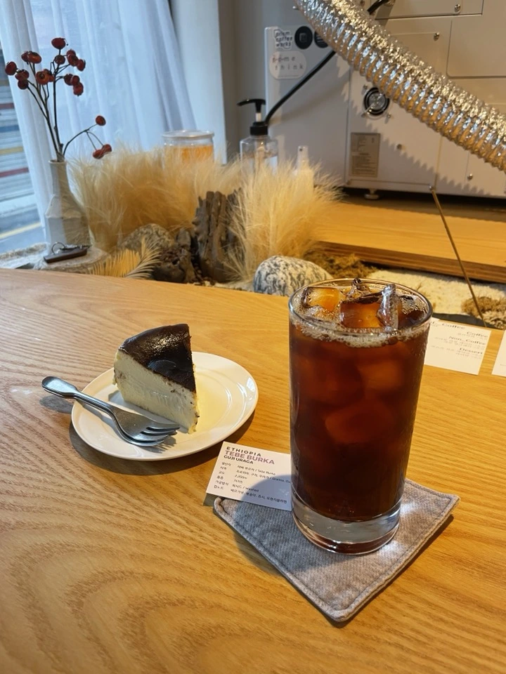 그러던 어느 날 우리 동네에 필터 커피 전문점이 생겼다는 소식을 들었다. 그 카페는 바로 '퇼 커피'였다. 사실 커피에 대한 기대감은 크게 없었다. 귀여운 밀리 사장님이 보고 싶기도 했고 맛나다는 튀르키예 전통 디저트 '카이막'이 더 궁금했다. 커피는 디저트를 즐기는 보조 수단 정도로만 생각했는지도 모른다. 처음 카페에 들어가서 커피를 주문하려고 보니 원두 종류가 다양했다. 창가 쪽에 로스팅 기계가 있는거로 봐선 직접 로스팅한 원두로 보여졌다. 가장 기대했던 카이막은 이미 품절되어 있었다. 실망이 가득했다. 하는 수 없이 치즈케이크와 함께 괜찮아보이는 원두를 골라 필터 커피를 아이스로 주문했다. 내가 고른 원두는 '에티오피아 테베 부르카' 였다. 이 원두의 커핑노트엔 '베르가못, 복숭아, 쥬시, 오렌지블라썸' 이라 쓰여 있었다. 산미가 가득해보이는 노트라 사실 걱정스러웠다. 이내 커피와 치즈케이크가 내 앞에 놓여졌다. 좁고 긴 유리컵에 담긴 커피 사이로 새초롬하게 얼음이 비치고 있었다. 일단 비쥬얼은 합격! 다음은 맛을 볼 차례였다. 조심스레 유리컵을 기울여 커피를 한 모금 마셔 보았다.