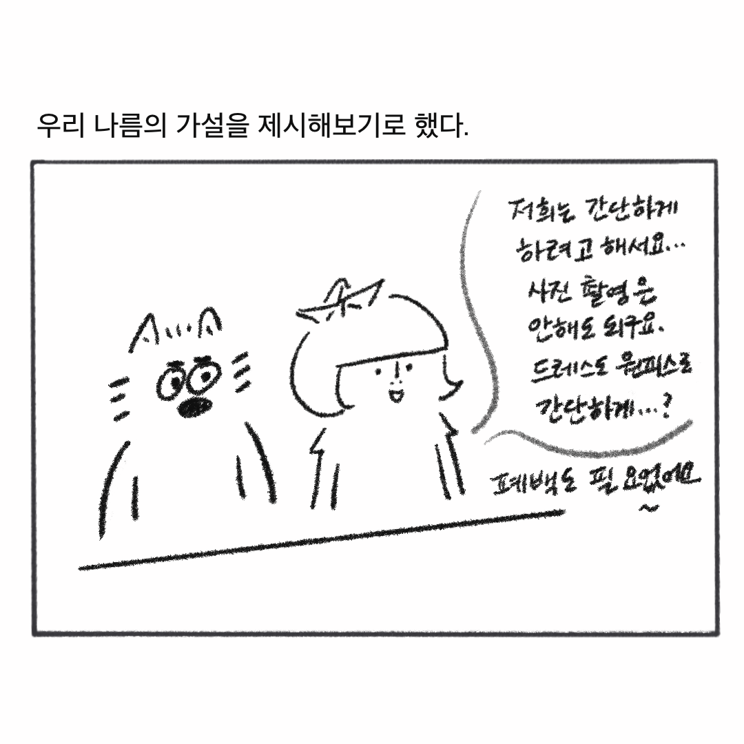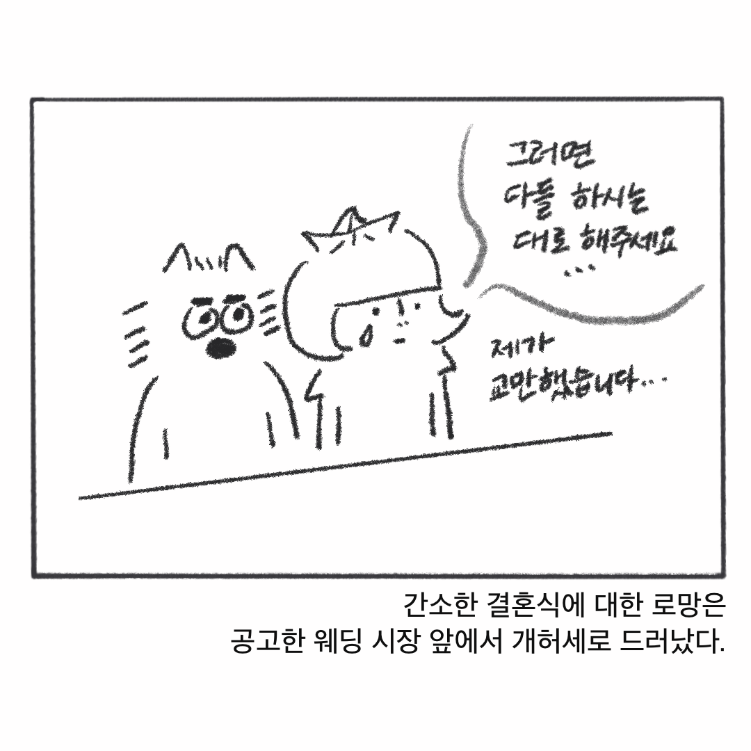 "아아, 그렇다. 사람들은 찍어내는 결혼을 하고 있다. 자신의 의사와도 상관없이 그저 대량생산하듯 자신의 삶을 타의로 찍어내고 있는 것이다!!!"라며... 스스로 그런 식으로 결혼을 맞이하지 않아야지, 특히 이벤트일 뿐인 결혼'식'에 관하여서는 더더욱 그러지 않겠노라 다짐했다.