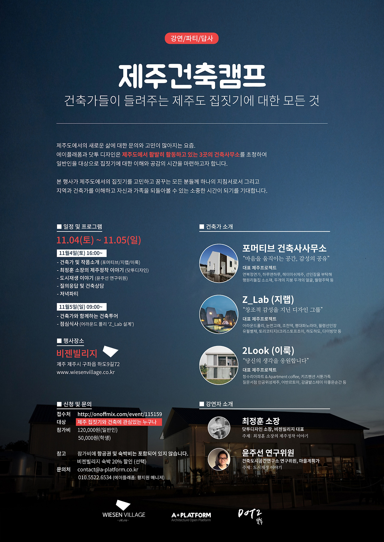 제주도에서의 새로운 삶에 대한 문의와 고민이 많아지는 요즘. 에이플래폼과 닷투 디자인은 제주도에서 활발히 활동하는 3곳의 건축사무소를 초청하여 일반인을 대상으로 집짓기에 대한 이해와 공감의 시간을 마련하고자 합니다.