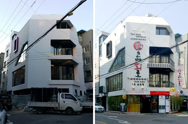 그런데 일사천리로 잘 진행될 것만 같았던 프로젝트가 도중에 일이 생겼어요. 완공될 즈음에 제가 사고가 났거든요. 퇴원하고 나서 현장에 가봤더니 설계했던 거와 달리 재료가 다 바뀌어 있었어요. 분명히 건축주와 시공자에게 샘플까지 보여주면서 진행했던 사항인데 제가 잠시 자리를 비운 틈에 외장재까지 시공사 마음대로 싹 다 바꿨어요. 설상가상으로 상가에 들어온 임차인은 건물을 간판으로 도배 해놨어요. 이후로는 상가건물 의뢰가 들어오면 간판 디자인까지도 제가 하겠다고 제안하려고 해요. 만약 제가 그때 사고가 없었다면 각설탕 빌딩이 지금과는 달라지지 않았을까 하는 아쉬움이 있어요.