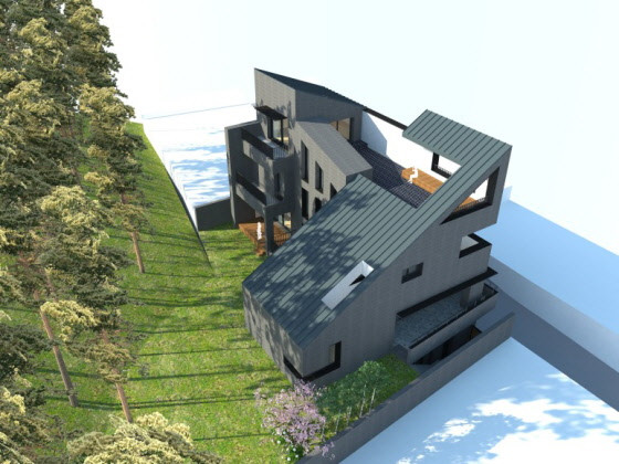 첫 프로젝트이기도 하고, 잘해보고 싶은 마음이 있었어요. 법적으로 복잡한 지역이었어요. 두 면이 도로에 접해 있기도 하고, 사면이 높이 제한을 받는 지역이었어요. 새로운 동선을 제안했으니까, 새로운 상가디자인을 제안해보고 싶었어요. (모형을 가리키며) 저렇게 깎인 부분이 법적인 제재 때문에 깎인 부분이거든요. 법적인 것을 법적인 것처럼 안 보이고 최대한 자연스럽게 디자인 하려했어요. 틀에 박힌 동선에서 벗어나게 디자인을 하는 게 포인트였어요. 의외로 건축주가 빨리, 디자인에 동의를 해주셨어요. 스케치업으로 보여드리니까 ‘이걸로 합시다.’라고 하셨어요.