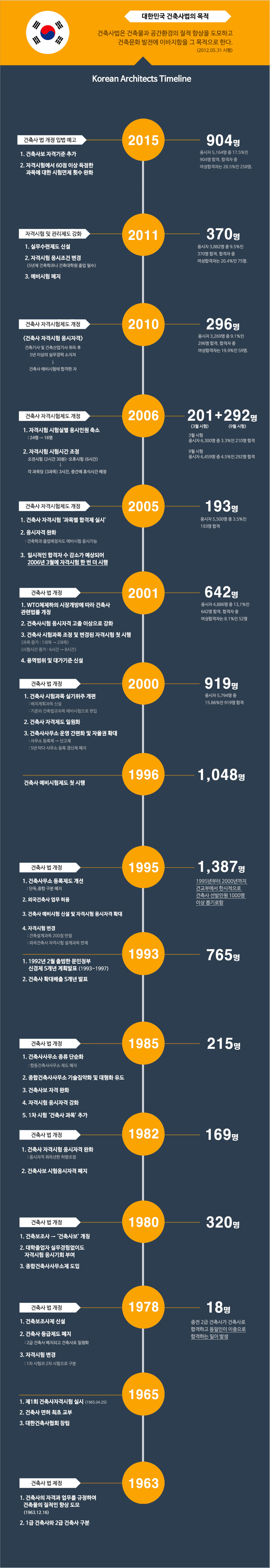 그러나 이후 합격인원은 감소하여 2000년 이후 연평균 400여 명의 건축사가 배출되고 있습니다.