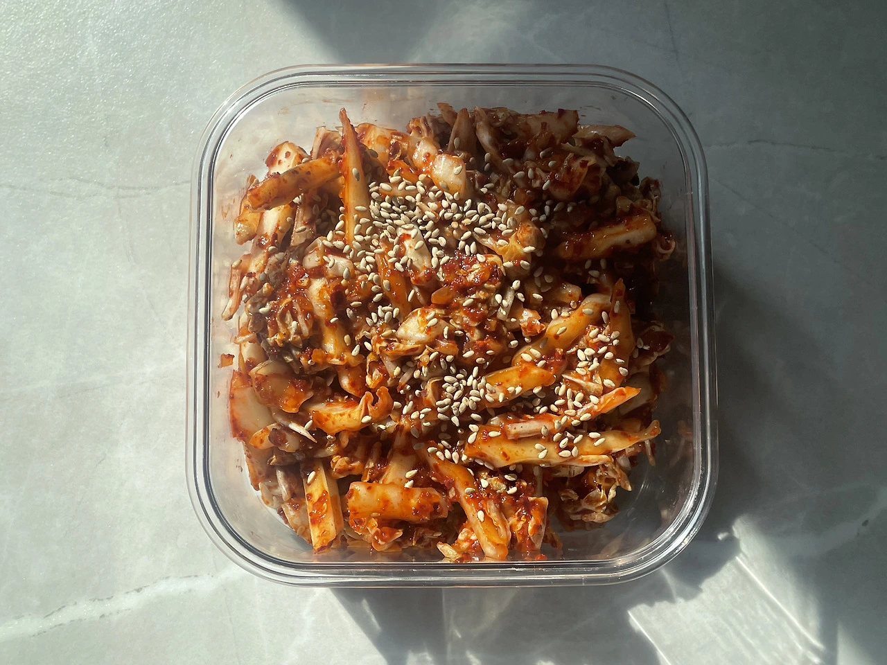 아이들의 이야기를 들으며, 어젯밤 자기 직전에 만들어 놓은 새빨간 겉절이 양념이 떠올랐다.