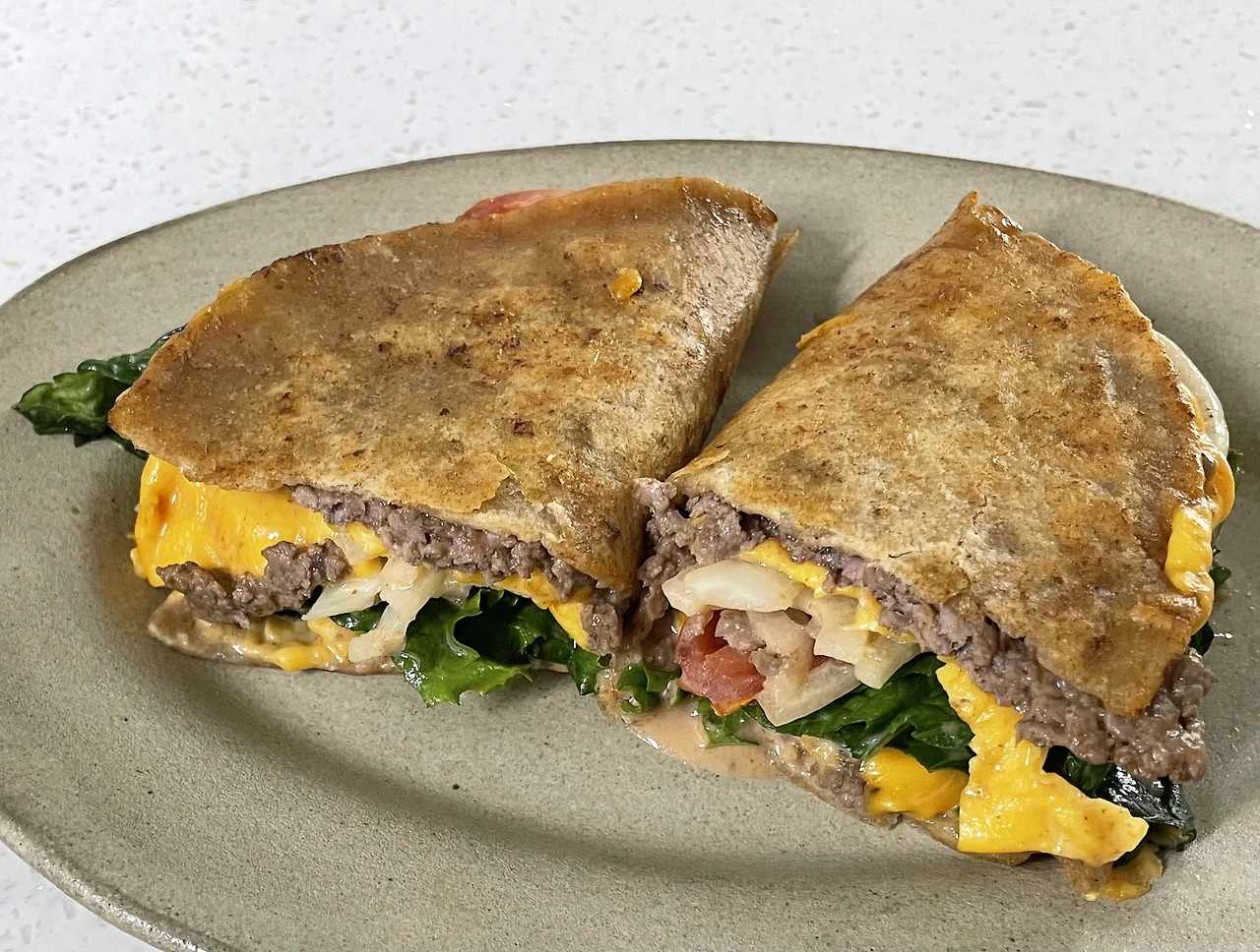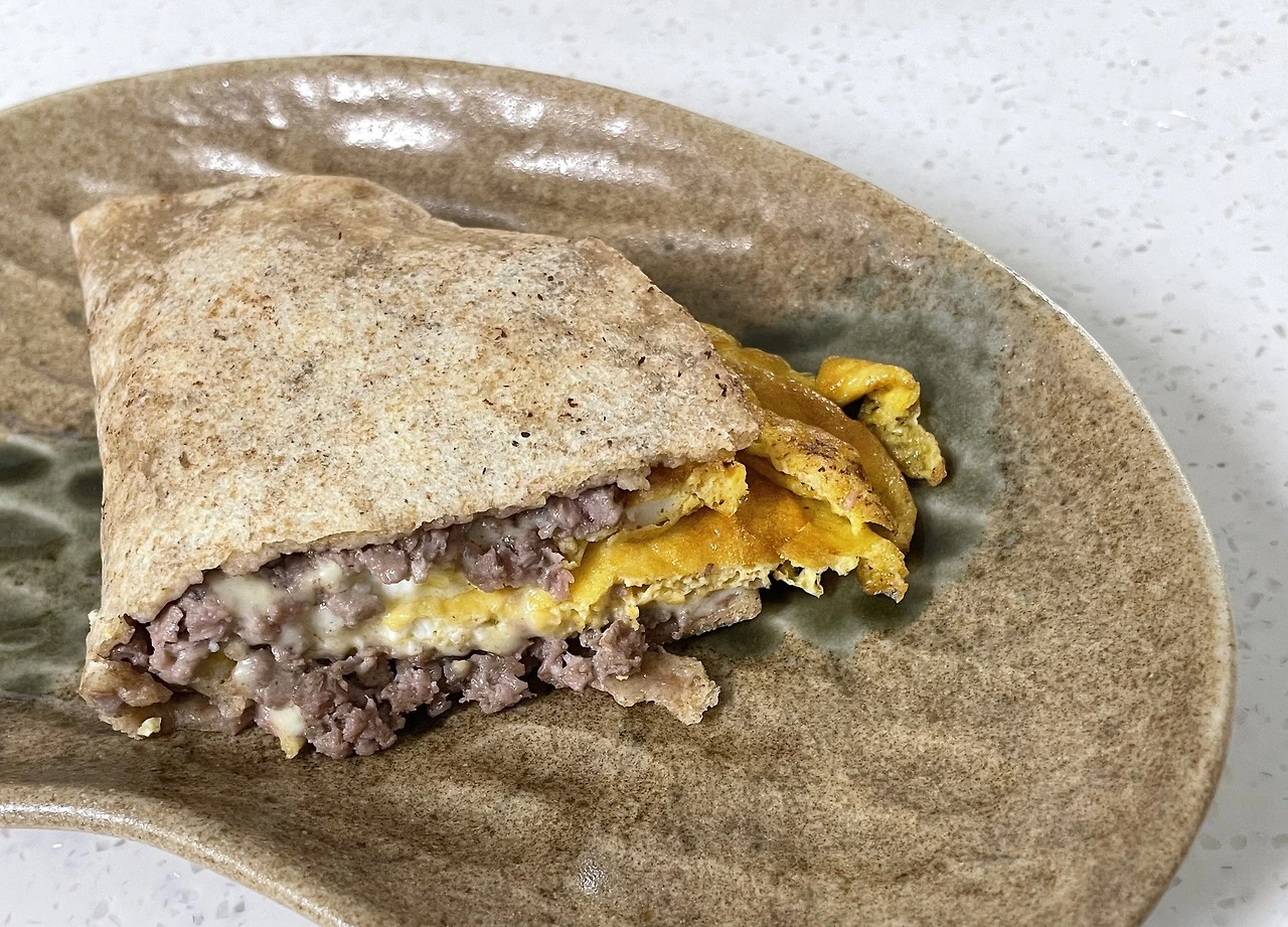 다음날 아침, 주방에 서서 널찍한 또띠아 위에 다진 소고기를 꾹꾹 눌러 펴고 달궈진 팬 위에 올렸다.