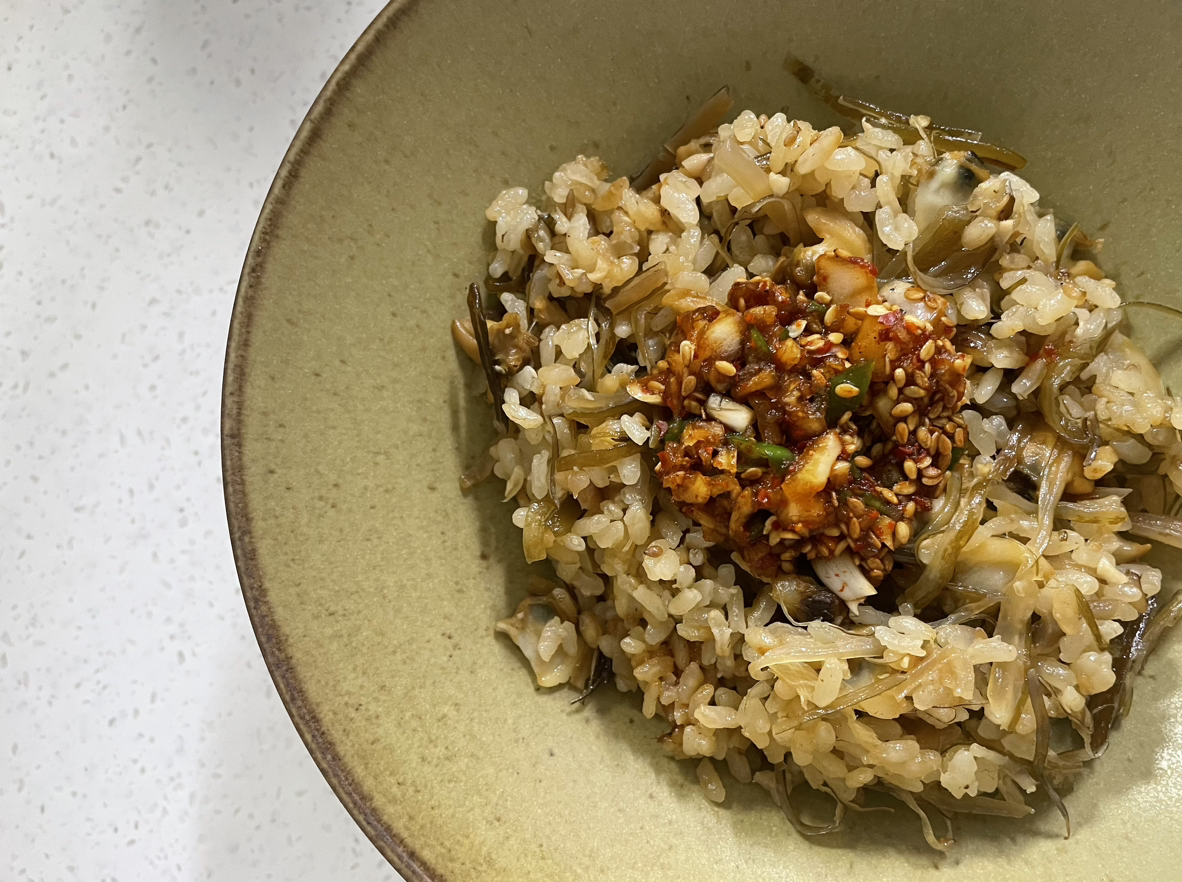 - 팬에 미역줄기볶음과 진간장, 다진 마늘을 살짝 넣고 볶다가 불린 쌀을 함께 넣어 볶고 밥을 안친다.