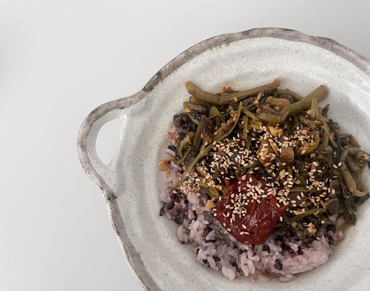 갓 지은 밥에 무청된장지짐을 올리고, 고추장 한 스푼, 참기름 한 바퀴 돌리면 완성-